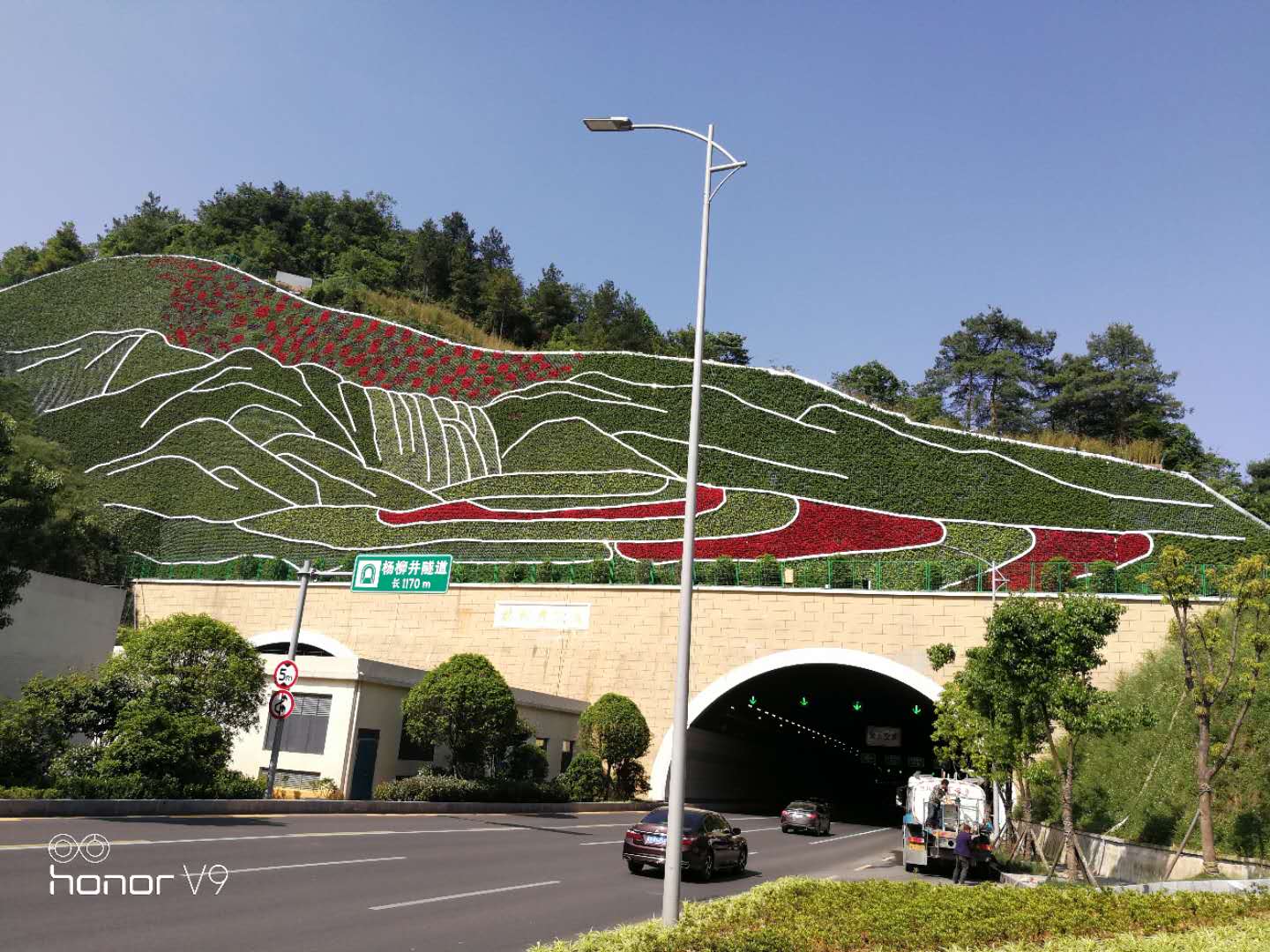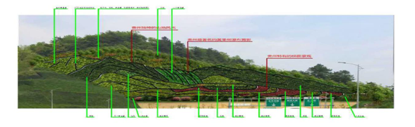 3、隧道口上方邊坡運用國畫中白描手法將貴州獨特的山、水、田園風光巧妙的融為一體,運用不同色彩的植物劃分,塑造層次豐富,立體感的垂直綠化景觀。